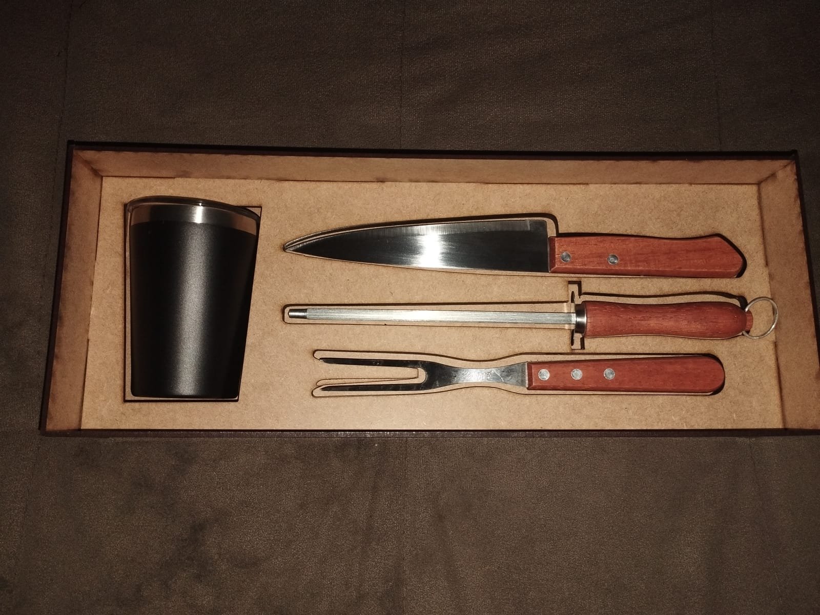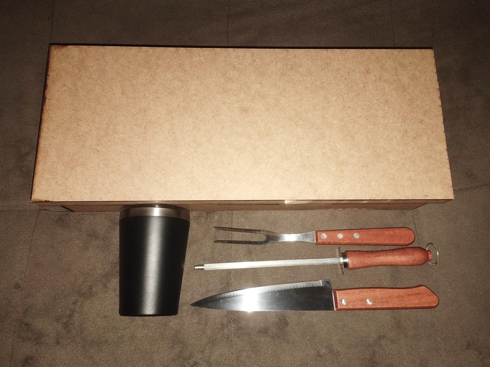 ✔ Caixa em MDF com rebaixo para encaixe do kit garfo e faca + copo