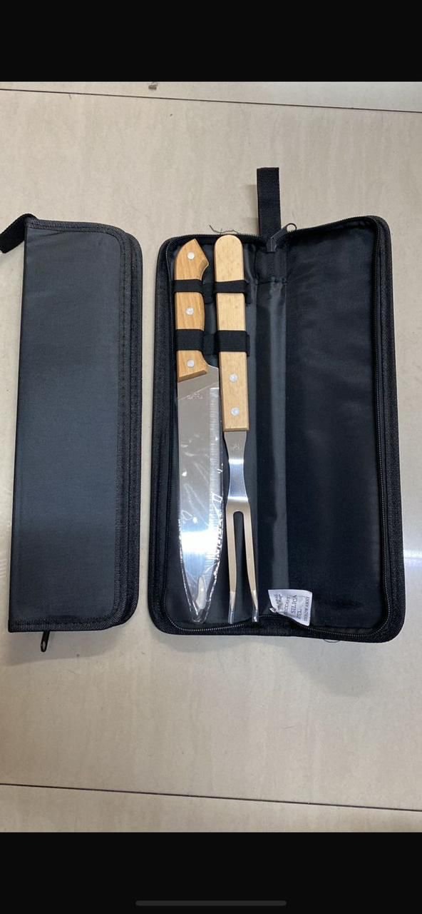Ele acompanha um estojo com alça, ideal para transporte e organização, além de itens essenciais para um churrasco de respeito: